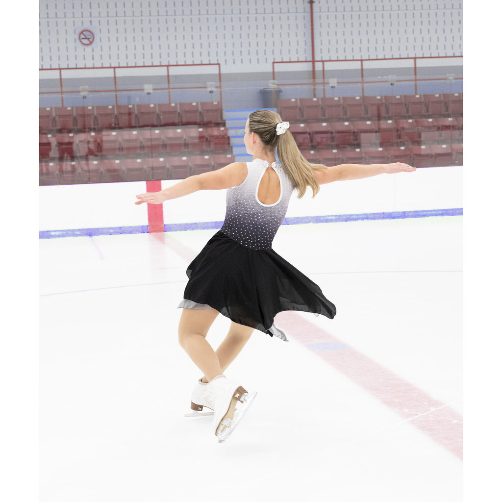 Timeless white and black design in an elegant shaded glitter lace with a high neck and classic back keyhole. The handkerchief skirt combines black georgette over silver chiffon for a flowy layered look. Lined for full coverage and is a bra-friendly option!