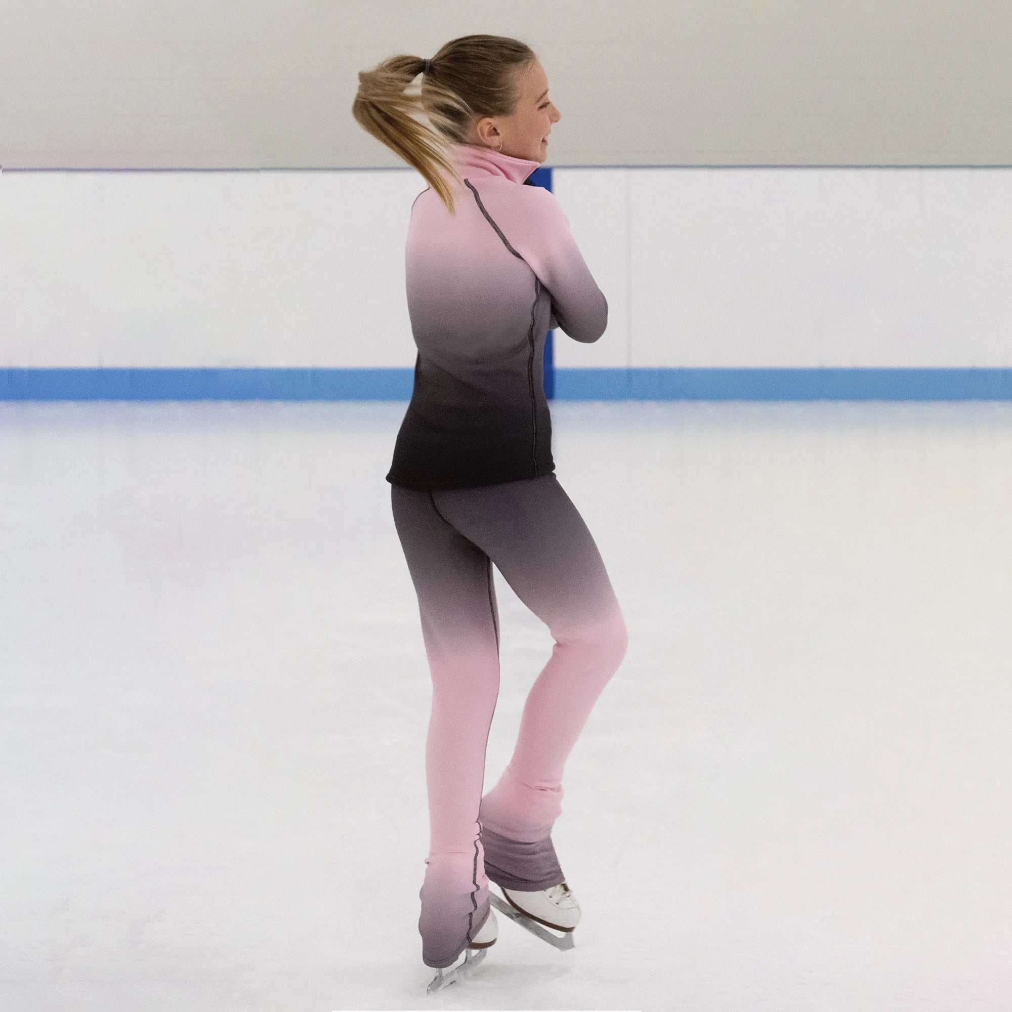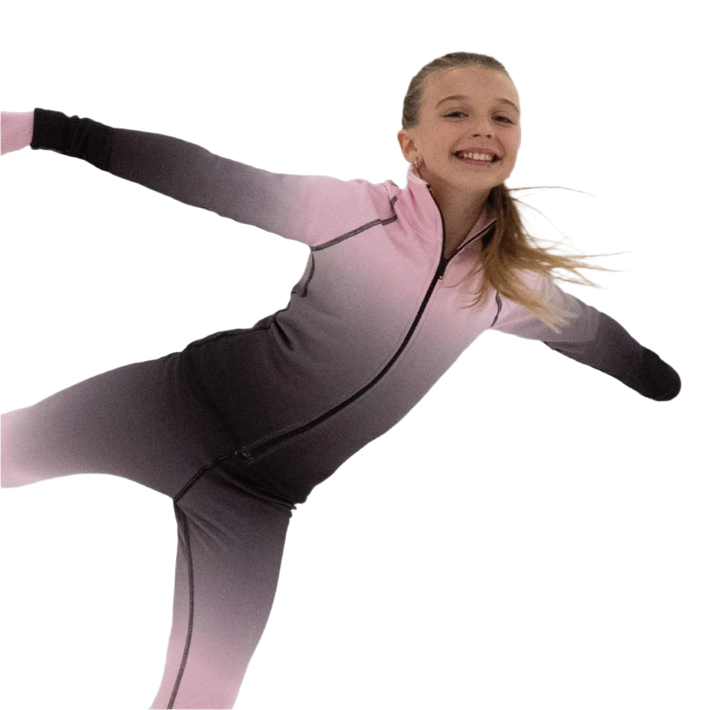 Fleece jacket brushed inside for softness and warmth and blending into shadowy black at the waist and wrists. Black zipper and contrast flat lock stitching.